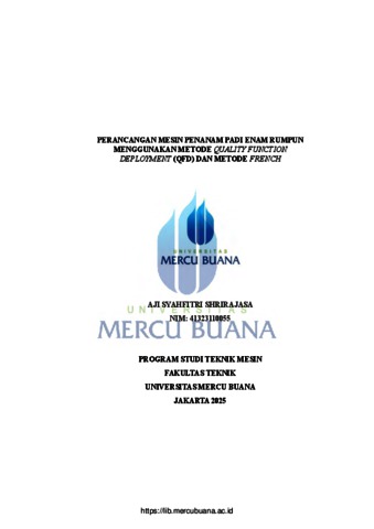 SHRIRAJASA, AJI SYAHFITRI (2025) PERANCANGAN MESIN PENANAM PADI ENAM RUMPUN MENGGUNAKAN METODE QUALITY FUNCTION DEPLOYMENT (QFD) DAN METODE FRENCH. S1 thesis, Universitas Mercu Buana Jakarta.