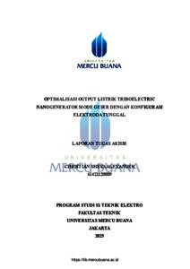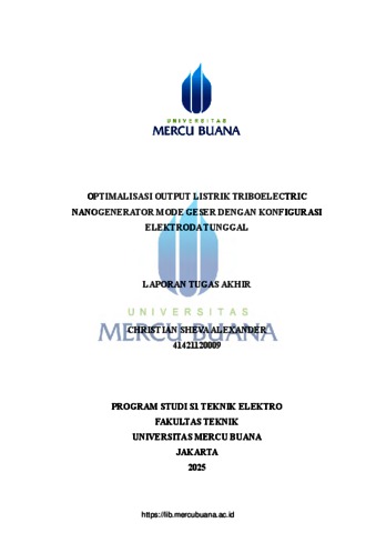 ALEXANDER, CHRISTIAN SHEVA (2025) OPTIMALISASI OUTPUT LISTRIK TRIBOELECTRIC NANOGENERATOR MODE GESER DENGAN KONFIGURASI ELEKTRODA TUNGGAL. S1 thesis, Universitas Mercu Buana Jakarta.