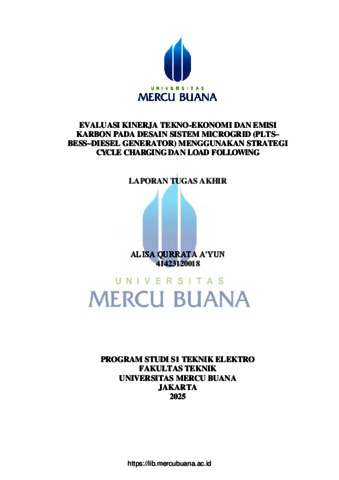 A'YUN, ALISA QURRATA (2025) EVALUASI KINERJA TEKNO-EKONOMI DAN EMISI KARBON PADA DESAIN SISTEM MICROGRID (PLTS - BESS - DIESEL GENERATOR) MENGGUNAKAN STRATEGI CYCLE CHARGING DAN LOAD FOLLOWING. S1 thesis, Universitas Mercu Buana Jakarta.