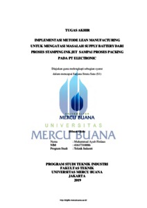 FIRDAUS, MUHAMMAD AYUB (2019) IMPLEMENTASI METODE LEAN MANUFACTURING UNTUK MENGATASI MASALAH SUPPLY BATTERY DARI PROSES STAMPING INK JET SAMPAI PROSES PACKING PADA PT ELECTRONIC. S1 thesis, UNIVERSITAS MERCU BUANA - BUNCIT.