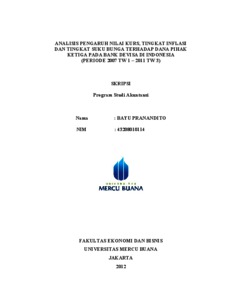 PRANANDITO, BAYU (2012) ANALISIS PENGARUH NILAI KURS, TINGKAT INFLASI DAN TINGKAT SUKU BUNGA TERHADAP DANA PIHAK KETIGA PADA BANK DEVISA DI INDONESIA (PERIODE 2007 TW 1 – 2011 TW 3). S1 thesis, Universitas Mercu Buana Jakarta.