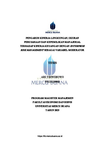 TRIWIBOWO, ARI (2025) PENGARUH KINERJA LINGKUNGAN, UKURAN PERUSAHAAN DAN KEPEMILIKAN MANAJERIAL TERHADAP KINERJA KEUANGAN DENGAN ENTERPRISE RISK MANAGEMENT SEBAGAI VARIABEL MODERATOR. S2 thesis, Universitas Mercu Buana.
