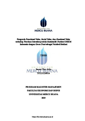 AIDA, IMANI NUR (2025) PENGARUH FUNCTIONAL VALUE, SOCIAL VALUE, DAN EMOTIONAL VALUE TERHADAP PURCHASE INTENTION PRODUK SUSTAINABLE FASHION UMKM INDONESIA DENGAN GREEN TRUST SEBAGAI VARIABEL MEDIASI. S2 thesis, Universitas Mercu Buana.