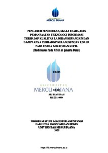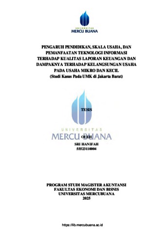 HANIFAH, SRI (2025) PENGARUH PENDIDIKAN, SKALA USAHA, DAN PEMANFAATAN TEKNOLOGI INFORMASI TERHADAP KUALITAS LAPORAN KEUANGAN DAN DAMPAKNYA TERHADAP KELANGSUNGAN USAHA PADA USAHA MIKRO DAN KECIL (Studi Kasus Pada UMK di Jakarta Barat). S2 thesis, Universitas Mercu Buana.