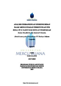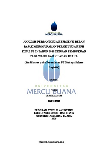 KALSUM, ULMI (2025) ANALISIS PERBANDINGAN EFISIENSI BEBAN PAJAK MENGGUNAKAN PERHITUNGAN PPH FINAL PP 23 TAHUN 2018 DENGAN PEMBUKUAN PADA WAJIB PAJAK BADAN USAHA (Studi kasus pada Perusahaan PT Hudaya Sukses Logistik). S1 thesis, Universitas Mercu Buana Jakarta.