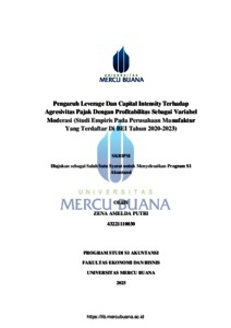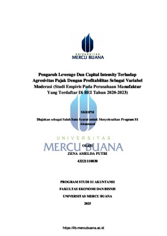 PUTRI, ZENA AMELDA (2025) PENGARUH LEVERAGE DAN CAPITAL INTENSITY TERHADAP AGRESIVITAS PAJAK DENGAN PROFITABILITAS SEBAGAI VARIABEL MODERASI (Studi Empiris Pada Perusahaan Manufaktur Yang Terdaftar Di BEI Tahun 2020-2023). S1 thesis, Universitas Mercu Buana Jakarta.