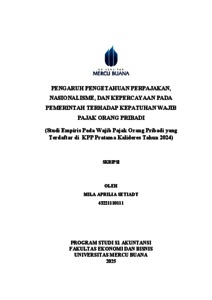 SETIADY, MILA APRILIA (2025) PENGARUH PENGETAHUAN PERPAJAKAN, NASIONALISME, DAN KEPERCAYAAN PADA PEMERINTAH TERHADAP KEPATUHAN WAJIB PAJAK ORANG PRIBADI (Studi Empiris Pada Wajib Pajak Orang Pribadi yang Terdaftar di KPP Pratama Kalideres Tahun 2024). S1 thesis, Universitas Mercu Buana Jakarta.