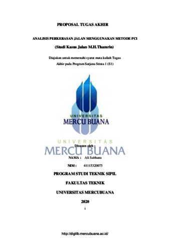 SUBHANA, ALI (2020) ANALISIS PERKERASAN JALAN MENGGUNAKAN METODE PCI (Studi Kasus Jalan M.H.Thamrin). S1 thesis, UNIVERISTAS MERCU BUANA - BUNCIT.