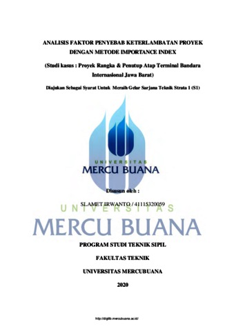 IRWANTO, SLAMET (2020) ANALISIS FAKTOR PENYEBAB KETERLAMBATAN PROYEK DENGAN METODE IMPORTANCE INDEX (STUDI KASUS : PROYEK RANGKA & PENUTUP ATAP TERMINAL BANDARA INTERNASIONAL JAWA BARAT). S1 thesis, UNIVERISTAS MERCU BUANA - BUNCIT.
