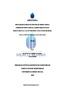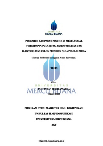 FEBRYAWARNA, PUTI INTAN (2025) PENGARUH KAMPANYE POLITIK DI MEDIA SOSIAL TERHADAP POPULARITAS, AKSEPTABILITAS DAN ELEKTABILITAS CALON PRESIDEN PADA PEMILIH MUDA (Survey Followers Instagram Anies Baswedan). S2 thesis, Universitas Mercu Buana Jakarta.
