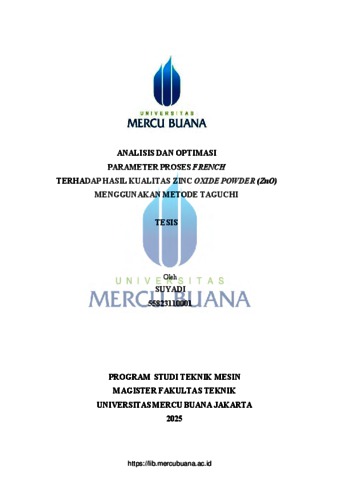 SUYADI, SUYADI (2025) ANALISIS DAN OPTIMASI PARAMETER PROSES FRENCH TERHADAP HASIL KUALITAS ZINC OXIDE POWDER (ZNO) MENGGUNAKAN METODE TAGUCHI. S2 thesis, Universitas Mercu Buana Jakarta.