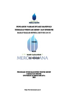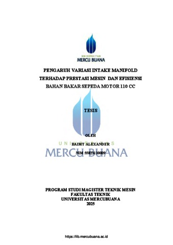 ALEXANDER, BAIMY (2025) PENGARUH VARIASI INTAKE MANIFOLD TERHADAP PRESTASI MESIN DAN EFISIENSI BAHAN BAKAR SEPEDA MOTOR 110 CC. S1 thesis, Universitas Mercu Buana Jakarta.