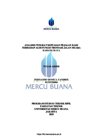 YANDRIE, FERNANDO DONICA (2025) ANALISIS TINGKAT KEPUASAN PEJALAN KAKI TERHADAP ALIH FUNGSI TROTOAR JALAN MUARA KARANG RAYA. S1 thesis, Universitas Mercu Buana Jakarta.