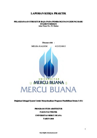 KALSUM, MELISA (2019) PELAKSANAAN STRUKTUR BAJA PADA PEMBANGUNAN GEDUNG BARU STASIUN MEDAN Jalan Timor No. 29, Medan. S1 thesis, UNIVERISTAS MERCU BUANA - BUNCIT.