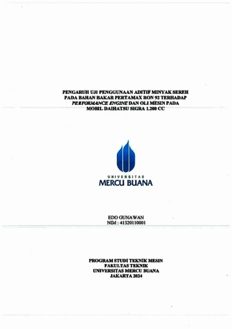 PENGARUH UJI PENGGUNAAN ADITIF MINY AK SEREH PADA BAHAN BAKAR PERT AMAX RON 92 TERHADAP PERFORMANCE ENGINE DAN OLI MESIN P ADA MOBIL DAIHATSU SIGRA 1.200 CC.