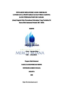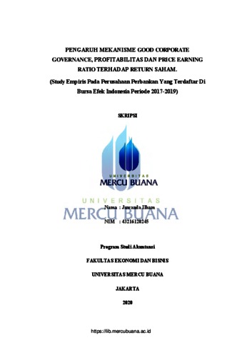 ILHAM, JUWANDA (2021) PENGARUH MEKANISME GOOD CORPORATE GOVERNANCE, PROFITABILITAS DAN PRICE EARNING RATIO TERHADAP RETURN SAHAM. (Study Empiris Pada Perusahaan Perbankan Yang Terdaftar Di Bursa Efek Indonesia Periode 2017-2019). S1 thesis, Universitas Mercu Buana Jakarta.