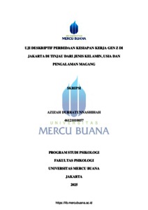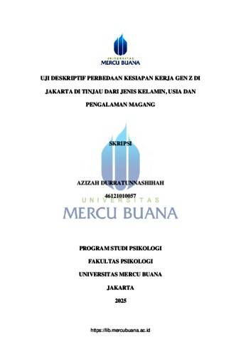 DURRATUNNASHIHAH, AZIZAH (2025) UJI DESKRIPTIF PERBEDAAN KESIAPAN KERJA GEN Z DI JAKARTA DI TINJAU DARI JENIS KELAMIN, USIA DAN PENGALAMAN MAGANG. S1 thesis, Universitas Mercu Buana Jakarta.