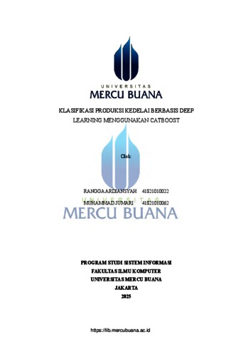 ARDIANSYAH, RANGGA (2025) KLASIFIKASI PRODUKSI KEDELAI BERBASIS DEEP LEARNING MENGGUNAKAN CATBOOST. S1 thesis, Universitas Mercu Buana Jakarta.