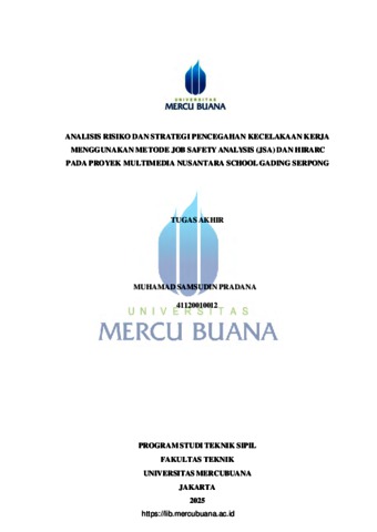 PRADANA, MUHAMAD SAMSUDIN (2025) ANALISIS RISIKO DAN STRATEGI PENCEGAHAN KECELAKAAN KERJA MENGGUNAKAN METODE JOB SAFETY ANALYSIS (JSA) DAN HIRARC PADA PROYEK MULTIMEDIA NUSANTARA SCHOOL GADING SERPONG. S1 thesis, Universitas Mercu Buana Jakarta.