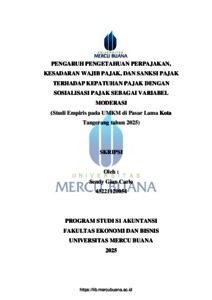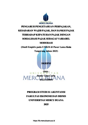 CARLO, SENDY GIAN (2025) PENGARUH PENGETAHUAN PERPAJAKAN, KESADARAN WAJIB PAJAK, DAN SANKSI PAJAK TERHADAP KEPATUHAN PAJAK DENGAN SOSIALISASI PAJAK SEBAGAI VARIABEL MODERASI (Studi Empiris pada UMKM di Pasar Lama Kota Tangerang tahun 2025). S1 thesis, Universitas Mercu Buana Jakarta.