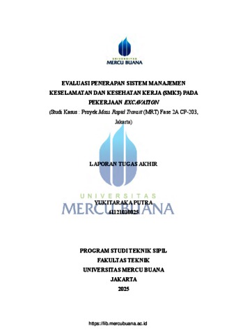 PUTRA, YUKITARAKA (2025) EVALUASI PENERAPAN SISTEM MANAJEMEN KESELAMATAN DAN KESEHATAN KERJA (SMK3) PADA PEKERJAAN EXCAVATION (Studi Kasus : Proyek Mass Rapid Transit (MRT) Fase 2A CP-203, Jakarta). S1 thesis, Universitas Mercu Buana Jakarta.