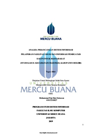 HARI SETIAWAN, MOHAMMAD PUJI (2019) ANALISA PERANCANGAN SISTEM INFORMASI PELAPORAN FASILITAS UMUM DAN INFORMASI PEMBUATAN E-KTP UNTUK MASYARAKAT (STUDI KASUS: KECAMATAN CILEUNGSI, KABUPATEN BOGOR). S1 thesis, UNIVERISTAS MERCU BUANA - BUNCIT.