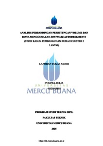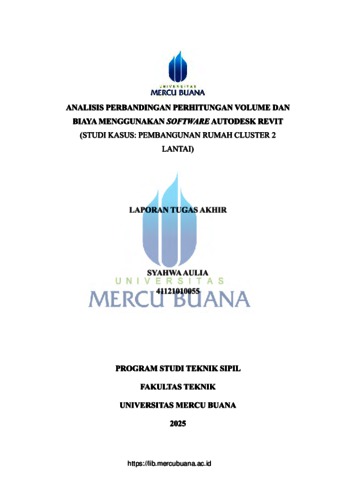 AULIA, SYAHWA (2025) ANALISIS PERBANDINGAN PERHITUNGAN VOLUME DAN BIAYA MENGGUNAKAN SOFTWARE AUTODESK REVIT (STUDI KASUS : PEMBANGUNAN RUMAH CLUSTER 2 LANTAI). S1 thesis, Universitas Mercu Buana Jakarta.