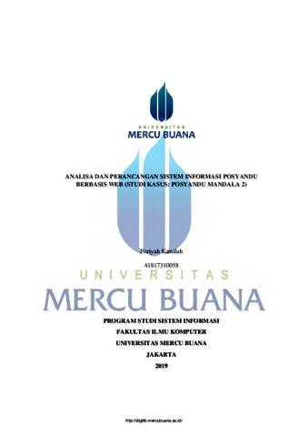 KAMILAH, FITRIYAH (2019) ANALISA DAN PERANCANGAN SISTEM INFORMASI POSYANDU BERBASIS WEB (STUDI KASUS: POSYANDU MANDALA 2). S1 thesis, UNIVERISTAS MERCU BUANA - BUNCIT.