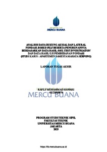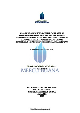 HAWARI, RAFLY MUHAMMAD (2025) ANALISIS DAYA DUKUNG AKSIAL DAN LATERAL FONDASI BORED PILE BESERTA PENURUNANNYA BERDASARKAN DATA HASIL SOIL TEST INVESTIGATION DAN DATA HASIL UJI PEMBEBANAN FONDASI (STUDI KASUS : APARTEMEN SAMESTA MAHATA SERPONG). S1 thesis, Universitas Mercu Buana Jakarta.