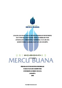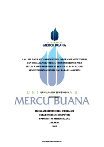 KURNIAWAN, ABDUL BASHIR (2019) ANALISA DAN RANCANGAN SISTEM INFORMASI MONITORING DAN TINDAKLANJUT HASIL TEMUAN BERBASIS WEB (STUDI KASUS: DIREKTORAT JENDERAL TATA RUANG KEMENTERIAN AGRARIA DAN TATA RUANG/BPN). S1 thesis, UNIVERISTAS MERCU BUANA - BUNCIT.
