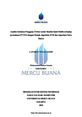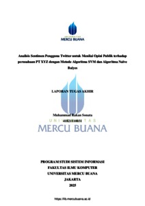 SONATA, MUHAMMAD RAKAN (2025) ANALISIS SENTIMEN PENGGUNA TWITTER UNTUK MENILAI OPINI PUBLIK TERHADAP PERUSAHAAN PT XYZ DENGAN METODE ALGORITMA SVM DAN ALGORITMA NAIVE BAIYES. S1 thesis, Universitas Mercu Buana Jakarta.