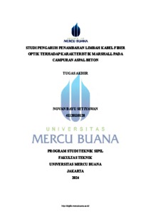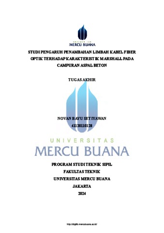 SETIYAWAN, NOVAN BAYU (2025) STUDI PENGARUH PENAMBAHAN LIMBAH KABEL FIBER OPTIK TERHADAP KARAKTERISTIK MARSHALL PADA CAMPURAN ASPAL BETON. S1 thesis, UNIVERSITAS MERCU BUANA - BUNCIT.