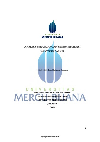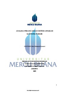 SUMANTRI, JOKO MUHAMAD (2019) ANALISA PERANCANGAN SISTEM APLIKASI KANTONG PARKIR. S1 thesis, UNIVERISTAS MERCU BUANA - BUNCIT.