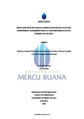 WULANDARI, LIA SRI (2025) PERAN JOB CRAFTING SEBAGAI MEDIATOR HUBUNGAN ANTARA EMPOWERING LEADERSHIP DENGAN TASK PERFORMANCE PADA PEKERJA DI JAKARTA. S1 thesis, UNIVERSITAS MERCU BUANA - BUNCIT.