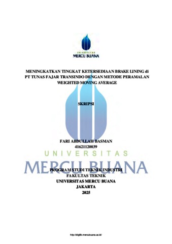 BASMAN, FARI ABDULLAH (2025) MENINGKATKAN TINGKAT KETERSEDIAAN BRAKE LINING di PT TUNAS FAJAR TRANSINDO DENGAN METODE PERAMALAN WEIGHTED MOVING AVERAGE. S1 thesis, UNIVERISTAS MERCU BUANA - BUNCIT.