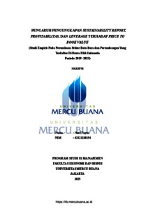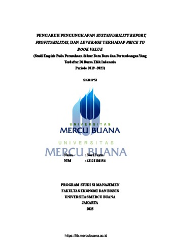 FAYZA, NOVI (2025) PENGARUH PENGUNGKAPAN SUSTAINABILITY REPORT, PROFITABILITAS, DAN LEVERAGE TERHADAP PRICE TO BOOK VALUE (Studi Empiris Pada Perusahaan Sektor Batu Bara dan Pertambangan Yang Terdaftar Di Bursa Efek Indonesia Periode 2019 -2023). S1 thesis, Universitas Mercu Buana Jakarta.