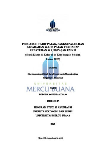 ATOLO, DEBORA AGNESIA (2025) PENGARUH TARIF PAJAK, SANKSI PAJAK DAN KESADARAN WAJIB PAJAK TERHADAP KEPATUHAN WAJIB PAJAK UMKM (Studi Kasus di Kelurahan Kembangan Selatan Tahun 2023). S1 thesis, Universitas Mercu Buana Jakarta.
