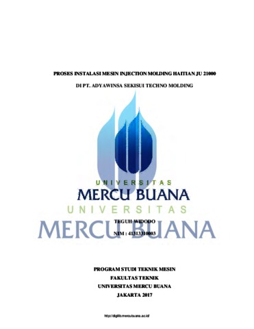 WIDODO, TEGUH (2017) PROSES INSTALASI MESIN INJECTION MOLDING HAITIAN JU 21000 DI PT. ADYAWINSA SEKISUI TECHNO MOLDING. S1 thesis, UNIVERSITAS MERCU BUANA - BUNCIT.