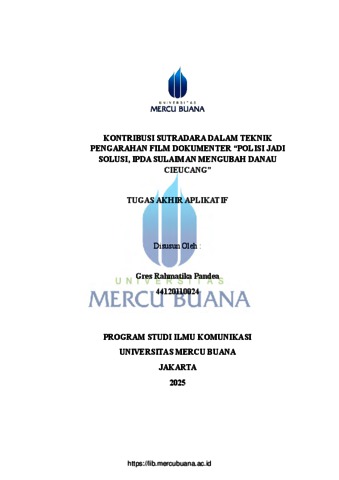 PANDEA, GRES RAHMATIKA (2025) KONTRIBUSI SUTRADARA DALAM TEKNIK PENGARAHAN FILM DOKUMENTER "POLISI JADI SOLUSI, IPDA SULAIMAN MENGUBAH DANAU CIEUCANG". S1 thesis, Universitas Mercu Buana Jakarta.