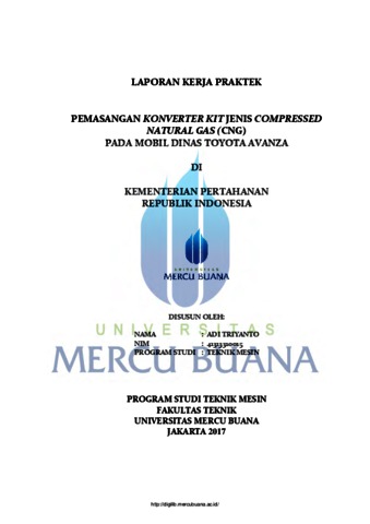 TRIYANTO, ADI (2017) PEMASANGAN KONVERTER KIT JENIS COMPRESSED NATURAL GAS (CNG) PADA MOBIL DINAS TOYOTA AVANZA DI KEMENTERIAN PERTAHANAN REPUBLIK INDONESIA. S1 thesis, UNIVERSITAS MERCU BUANA - BUNCIT.