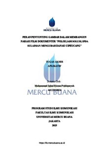 PRIDIANSYAH, MOHAMMAD IQBAL RIZMA (2025) PERAN PENYUNTING GAMBAR DALAM MEMBANGUN NARASI FILM DOKUMENTER "POLISI JADI SOLUSI, IPDA SULAIMAN MENGUBAH DANAU CIPEUCANG". S1 thesis, Universitas Mercu Buana Jakarta.
