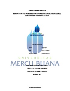 SUPRAPTO, SUPRAPTO (2017) PERAWATAN DAN PEMERIKSAAN KOMPRESOR UDARA ATLAS COPCO DI PT. INDESSO AROMA CILEUNGSI. S1 thesis, UNIVERSITAS MERCU BUANA - BUNCIT.
