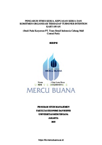 ROSA, GIAN LANA (2025) PENGARUH STRES KERJA, KEPUASAN KERJA DAN KOMITMEN ORGANISASI TERHADAP TURNOVER INTENTION KARYAWAN (Studi Pada Karyawan PT. Trans Retail Indonesia Cabang Mall Central Park). S1 thesis, Universitas Mercu Buana Jakarta.