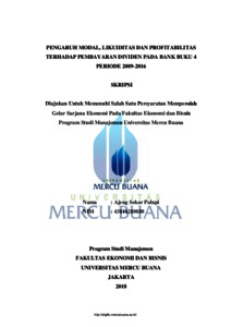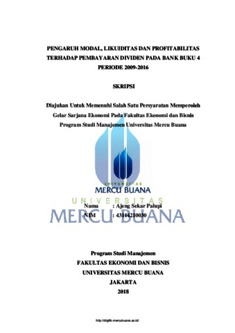 PALUPI, AJENG SEKAR (2018) PENGARUH MODAL, LIKUIDITAS DAN PROFITABILITAS TERHADAP PEMBAYARAN DIVIDEN PADA BANK BUKU 4 PERIODE 2009-2016. S1 thesis, UNIVERISTAS MERCU BUANA - BUNCIT.