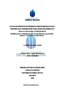 SINAGA, DANIA CELLA ULINI BR (2025) EVALUASI EFEKTIVITAS PENERAPAN BIM 5D MENGGUNAKAN METODE LEAN CONSTRUCTION PADA STRUKTUR JEMBATANDENGAN SOFTWARE AUTODESK REVIT (STUDI KASUS: UNDERPASS STA 49+750 PROYEK JALAN TOL BINJAI - PANGKALAN BRANDAN). S1 thesis, Universitas Mercu Buana Jakarta.