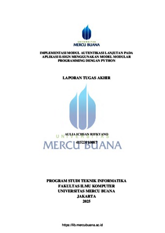 RIFKYANO, AULIA ICHSAN (2025) IMPLEMENTASI MODUL AUTENTIKASI LANJUTAN PADA APLIKASI E-SIGN MENGGUNAKAN MODEL MODULAR PROGRAMMING DENGAN PYTHON. S1 thesis, Universitas Mercu Buana Jakarta.