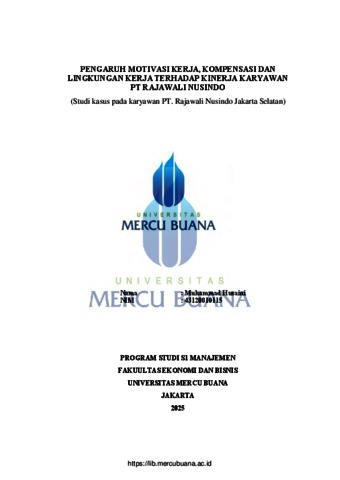 HUSAINI, MUHAMMAD (2025) PENGARUH MOTIVASI KERJA, KOMPENSASI DAN LINGKUNGAN KERJA TERHADAP KINERJA KARYAWAN PT RAJAWALI NUSINDO (Studi kasus pada karyawan PT. Rajawali Nusindo Jakarta Selatan). S1 thesis, Universitas Mercu Buana Jakarta.