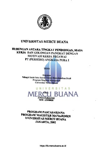 SUBAGYO, JOKO (2002) HUBUNGAN ANTARA TINGKAT PENDIDIKAN, MASA KERJA DAN GOLONGAN PANGKAT DENGAN MOTIVASI KERJA PEGAWAI PT (PERSERO) ANGKASA PURA I. S2 thesis, Universitas Mercu Buana Jakarta.