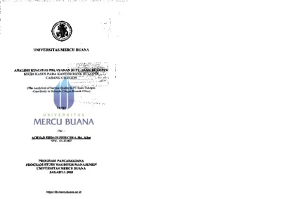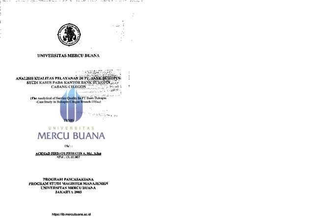 PRIHATIN, ACHMAD FIRDAUS (2003) ANALISIS KUALITAS PELAYANAN DI PT. BANK BUKOPIN- STUDI KASUS PADA KANTOR BANK BUKOPIN CABANG CILEGON (The Analytical of Service Quality In PT. Bank Bukopin - Case Study In Bukopin Cilegon Branch Office). S2 thesis, Universitas Mercu Buana Jakarta.