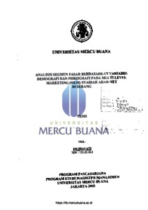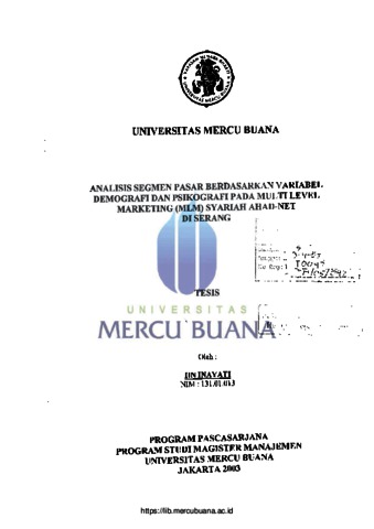 INAYATI, IIN (2003) ANALISIS SEGMEN PASAR BERDASARKAN VARIABEL DEMOGRAFI DAN PSIKOGRAFI PADA MULTI LEVEL MARKETING (MLM) SYARIAH AHAD-NET DI SERANG. S2 thesis, Universitas Mercu Buana Jakarta.